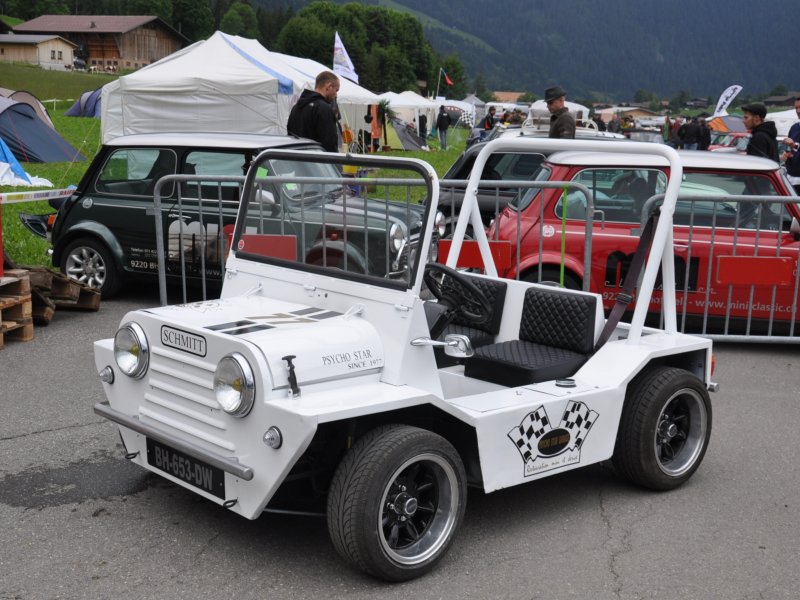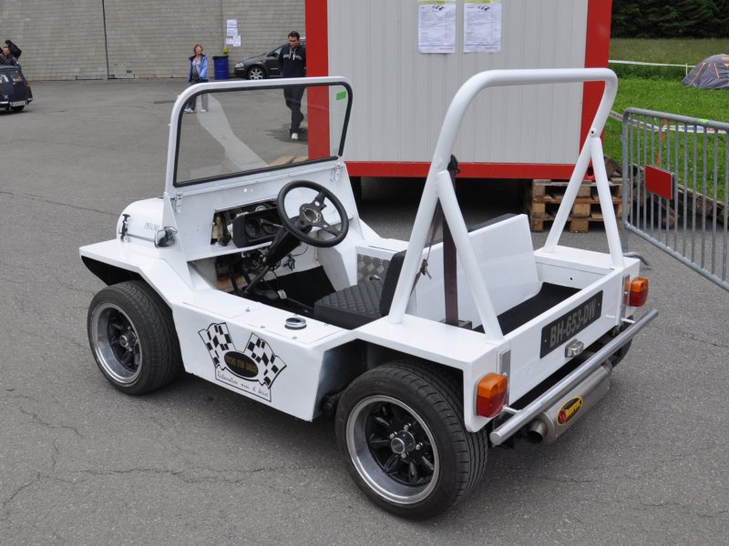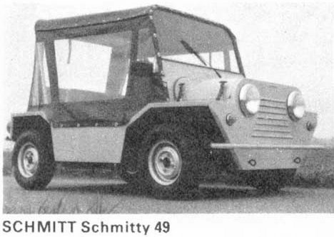 Jean-Claude Hrubon's Schmitt 6CV with Mini 1000cc mechanicals is “inspired by the Mini Moke but more compact (length 210cm). There’s a quadricycle version dubbed the Schmitty with a 49cc engine (pic). Hrubon experimented with a six wheel version but it was never manufactured.” |