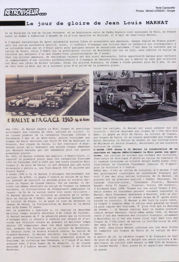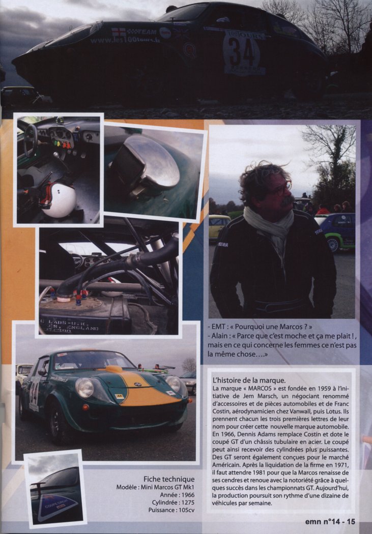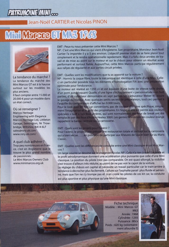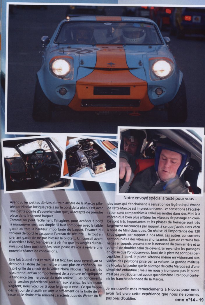 | Reproduced with the kind permission of Esprit Mini Team, this article tells the story of the Mini Marcos with interviews of the owners of two classic cars, Alain Jaquart (1966 Mk.I) and Nicolas Pinon 91968 Mk.III). The last page is all about Jean-Louis Marnat's moment of glory, but it seems to end before the 1966 24 Heures. |