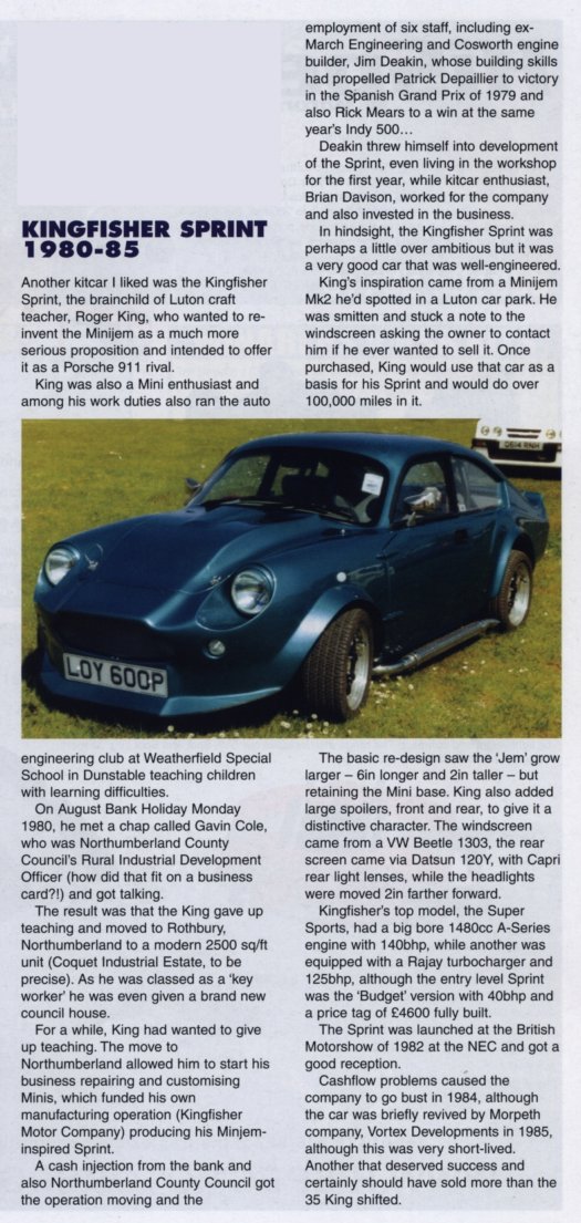 | This is a three page profile of MMOC member John Crowson’s Sussex Kitcars which is deservedly glowing with praise. We're not sure if “Barn Find” refers to the Mini Marcos or John’s premeses in Horam! Note the two Marcos coupés in the background. |